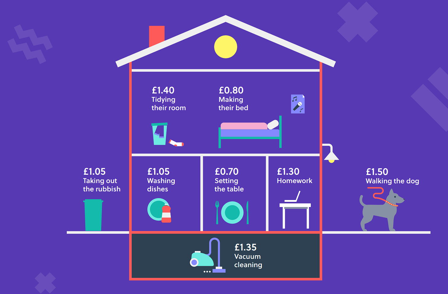 The startup has analyzed the financial habits of 75,000 British children aged 6 to 18. By doing this, they’ve represented how much the children earned and how, when, and where they’re spending (or saving) their money. The upper graph explains how much a child is making by doing certain chores (Making the bed and taking out the rubbish seems the best return on efforts!)