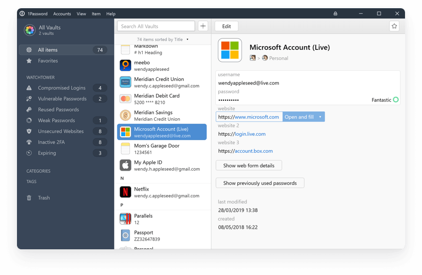 1Password is a high-security password creation and management solution for individuals and enterprises. It provides a place for users to store passwords, files, and other sensitive information in multiples virtual vaults that are locked with a PBKDF2-guarded master password. The service works cross-platform and makes it easier and safer for everyone to share personal information.